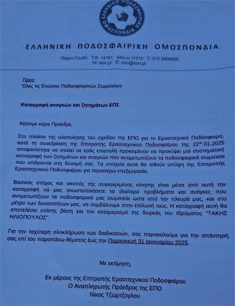 Επιστολή σε όλες τις Eνώσεις ποδοσφαιρικών σωματείων έστειλε η επιτροπή ερασιτεχνικού ποδοσφαίρου της ΕΠΟ.