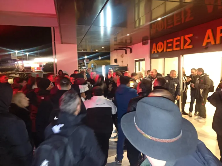 Δεκάδες φίλοι του ΟΦΗ περίμεναν τη νύχτα την αποστολή του ΟΦΗ στο αεροδρόμιο “Νίκος Καζαντζάκης” για να την αποθεώσουν μετά το διπλό στη Τρίπολη