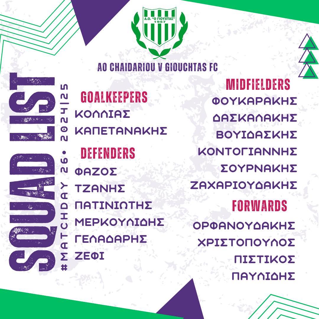 Στα αγωνιστικά ο Μανολής Σουτζής δεν υπολογίζει τους τιμωρημένους με κάρτες Παπαδομιχελάκη, Μακατουνάκη και Μαυρογιαννάκη καθώς επίσης τους τραυματίες Μπουρσέλη και Κορνηλάκη.