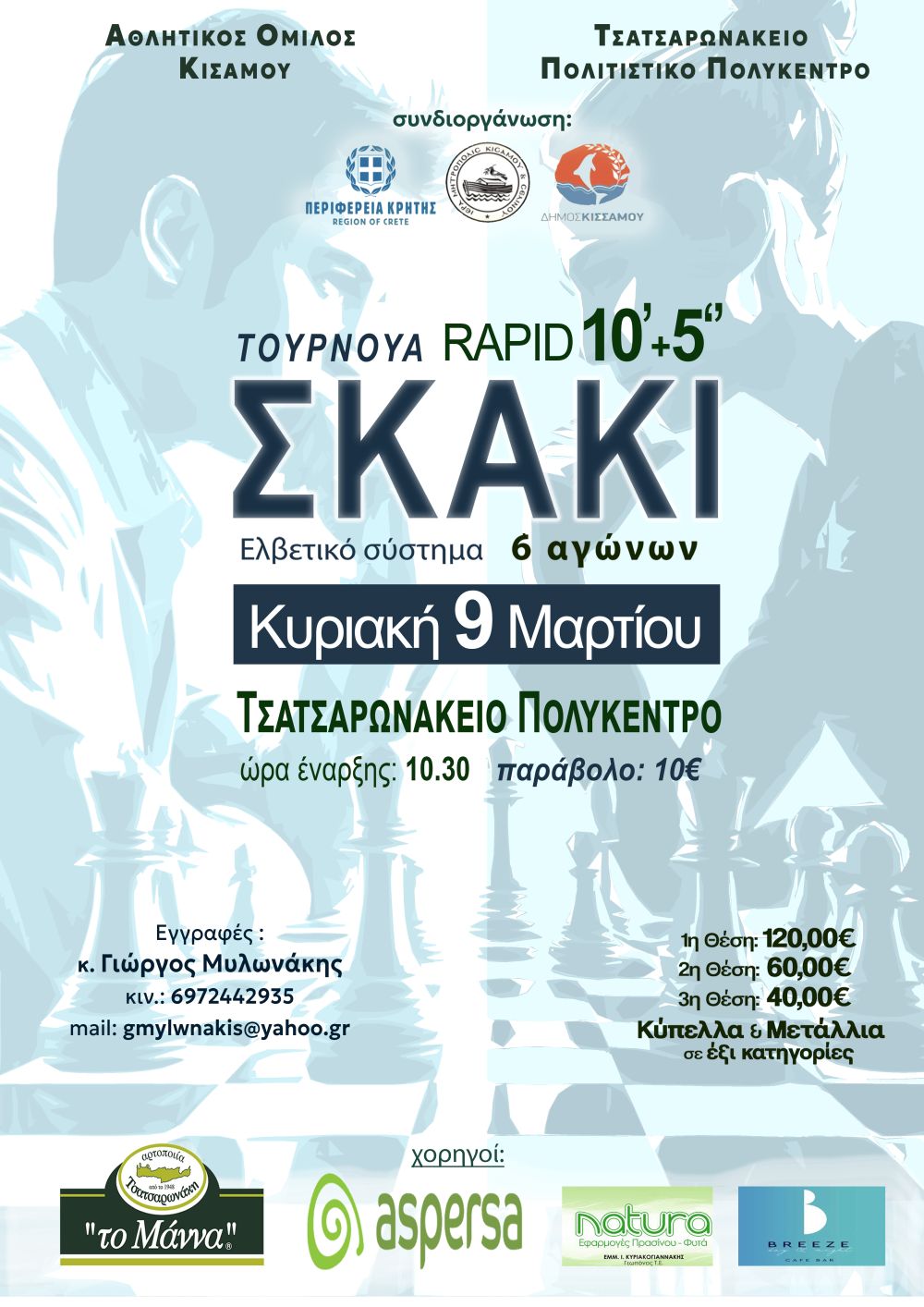 Ο Αθλητικός Όμιλος Κισάμου και το Tσατσαρωνάκειο Πολιτιστικό Πολύκεντρο με την υποστήριξη της Ι. Μητροπόλεως Κισάμου & Σελίνου, της Περιφέρειας Κρήτης και του Δήμου Κισάμου, προκηρύσσουν την διεξαγωγή τουρνουά RAPID Σκάκι, την Κυριακή 9 Μαρτίου 2025.