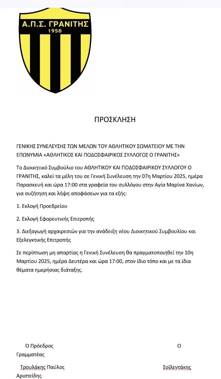 Σε εκλογές για την ανάδειξη νέου Διοικητικού Συμβουλίου, θα προχωρήσει το επόμενο διάστημα ο Γρανίτης.