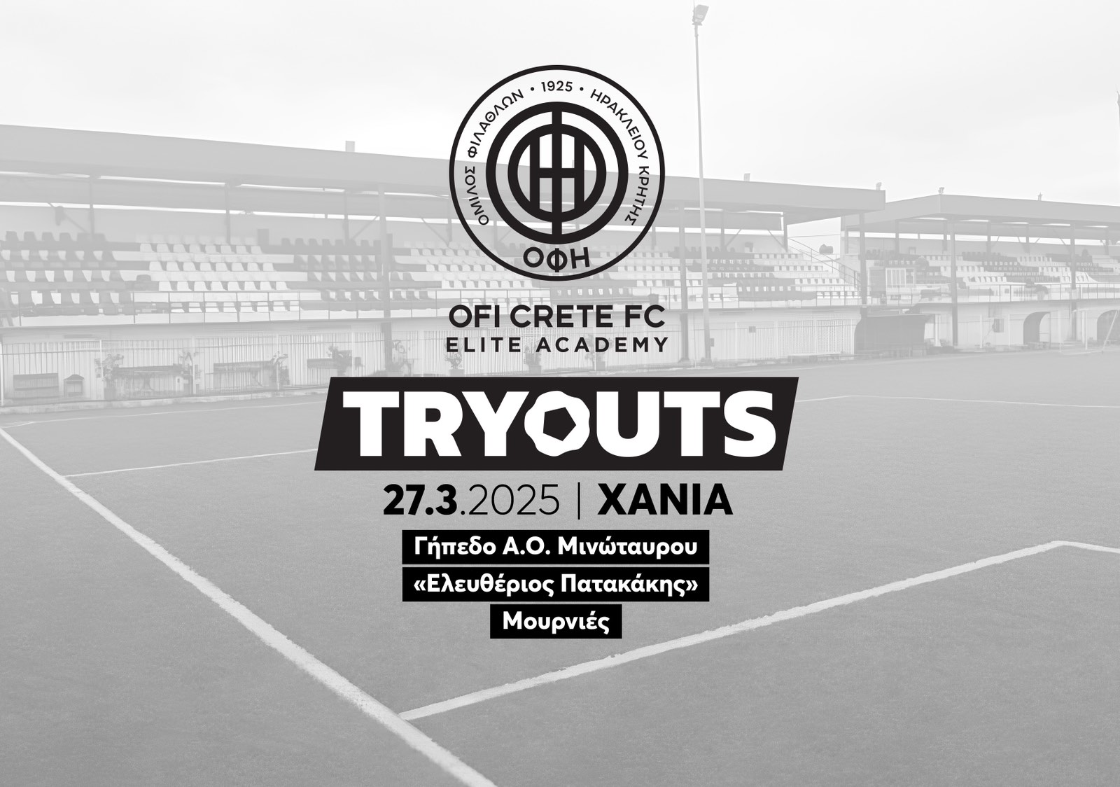 Η ΠΑΕ ΟΦΗ 1925, διοργανώνει δοκιμαστικές προπονήσεις (tryouts) την Πέμπτη 27/3 στα Χανιά, για την επιλογή νεαρών ποδοσφαιριστών που θα στελεχώσουν τις ομάδες της Elite Ακαδημίας, για την σεζόν 2025-26.