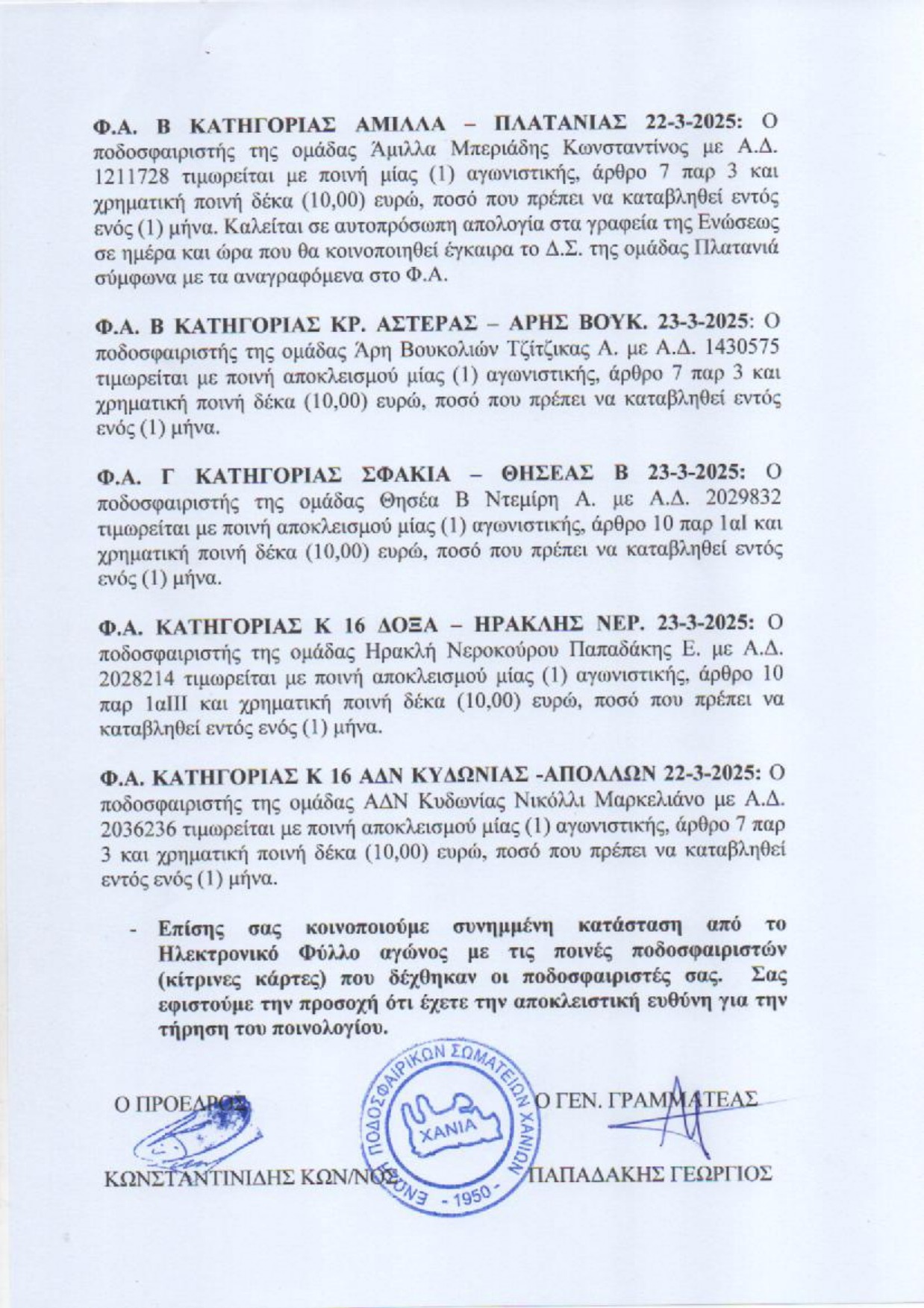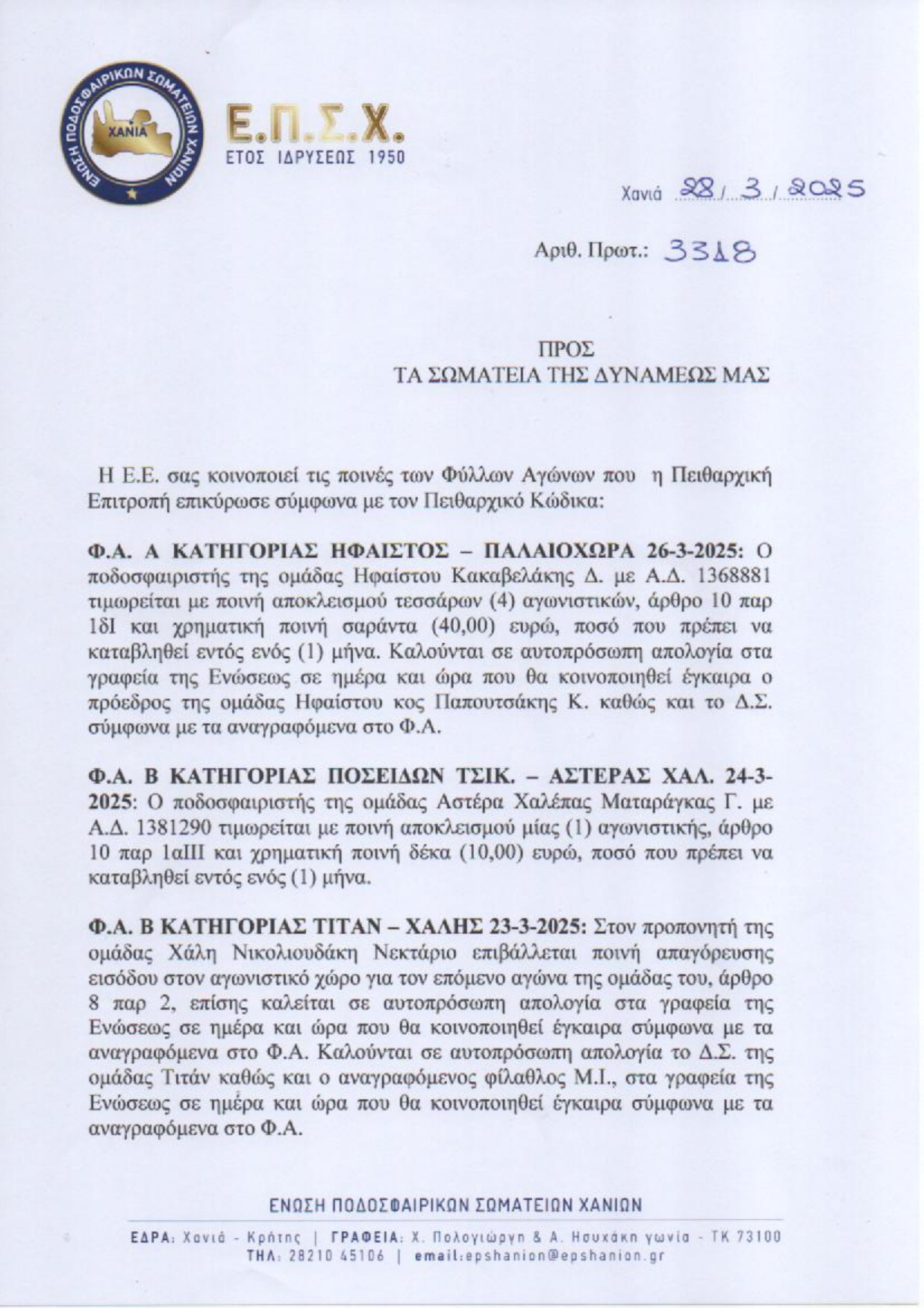 Γνωστές έγιναν οι ποινές που επέβαλε η Πειθαρχική Επιτροπή της ΕΠΣΧ για τα ματς της περασμένης αγωνιστικής στα τοπικά πρωταθλήματα Χανίων.