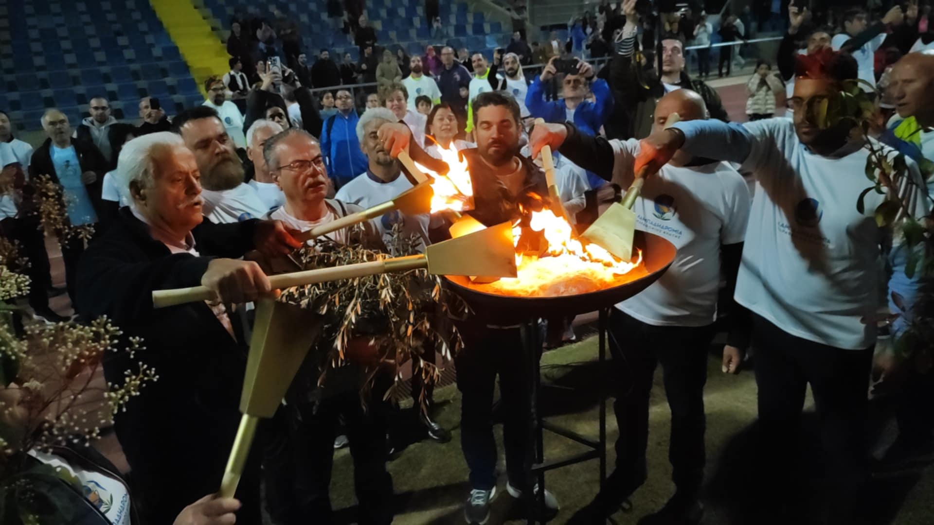 Κρατώντας τις δάδες και τον κότινο από την αρχαία ελιά των Βουβών δήμαρχοι του νομού, διοργανωτές και δρομείς, μετέφεραν απόψε στο Εθνικό Στάδιο Χανίων τη φλόγα που σηματοδότησε την έναρξη του φετινού Μαραθωνίου Κρήτης.
