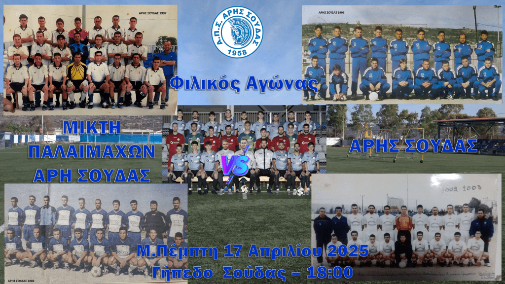 Η ποδοσφαιρική συνάντηση Μικτή Παλαιμάχων Άρη vs Τρέχουσας Ομάδας Άρη θα διεξαχθεί την Μεγάλη Πέμπτη 17 Απριλίου 2025, στο Γήπεδο της Σούδας (18:00), και αναμένεται να φέρει κοντά παίκτες, φιλάθλους και ολόκληρη την τοπική κοινότητα σε μια βραδιά γεμάτη νοσταλγία, αθλητικό πνεύμα και διασκέδαση.