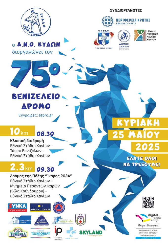 Για την Κυριακή 25 Μαίου είναι προγραμματισμένοι να γίνουν ο 75oς Βενιζέλειος Αγώνα Δρόμου καθώς και ο Δρόμος Πόλης «Ικάρος 2025» που διοργανώνει ο Α.Ν.Ο. Κύδων.