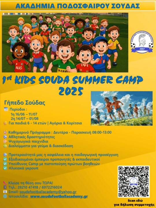 Πρόκειται για το summer camp που διοργανώνεται από την Ακαδημία Ποδοσφαίρου Σούδας και αφορά παιδιά από έξι έως και 14 χρονών.