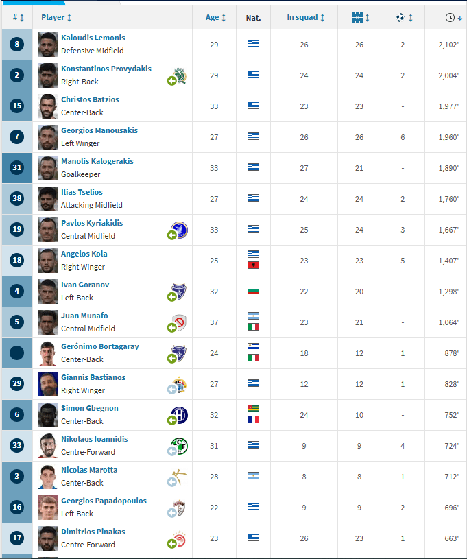 Για παράδειγμα ο Καλούδης Λεμονής είναι ο πρώτος σε χρόνο συμμετοχής στο περσινό πρωτάθλημα με 2.102 λεπτά και ακολουθεί ο Κώστας Προβυδάκης με 2.004. Ο Ηρακλειώτης δεξιός μπακ ήταν η πρώτη μεταγραφή του περασμένου καλοκαιριού έχοντας σημαντικό ρόλο στην ομάδα ενώ πέτυχε παράλληλα και δύο γκολ στο φετινό πρωτάθλημα.