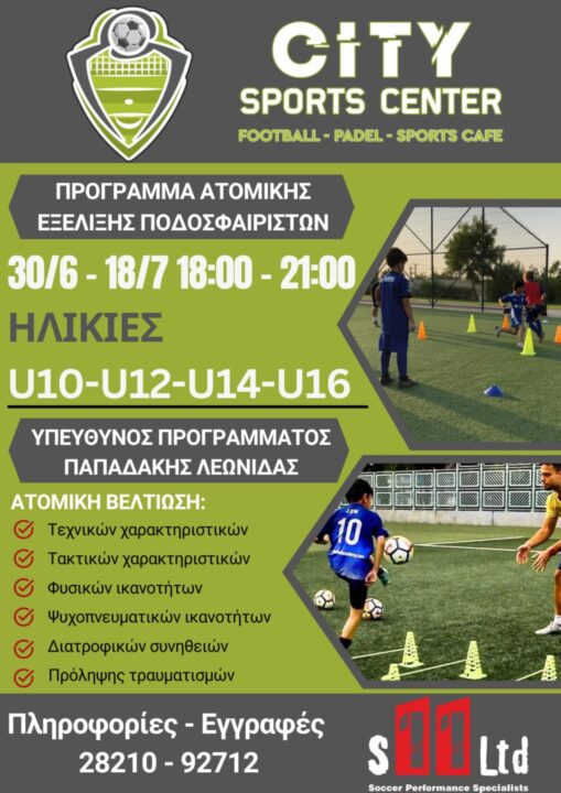 Το City Sport Center και η S11 Ltd συνεργάζονται για την υλοποίηση ενός καινοτόμου προγράμματος ατομικής εξέλιξης για νεαρούς ποδοσφαιριστές, με επικεφαλής τον καταξιωμένο προπονητή Λεωνίδα Παπαδάκη. Το προπονητικό camp θα πραγματοποιηθεί από 30 Ιουνίου έως 18 Ιουλίου, Δευτέρα -Τεταρτη- Παρασκευή 18:00 – 21:00, και απευθύνεται σε αθλητές ηλικιακών κατηγοριών U12, U14, U16 και U19.