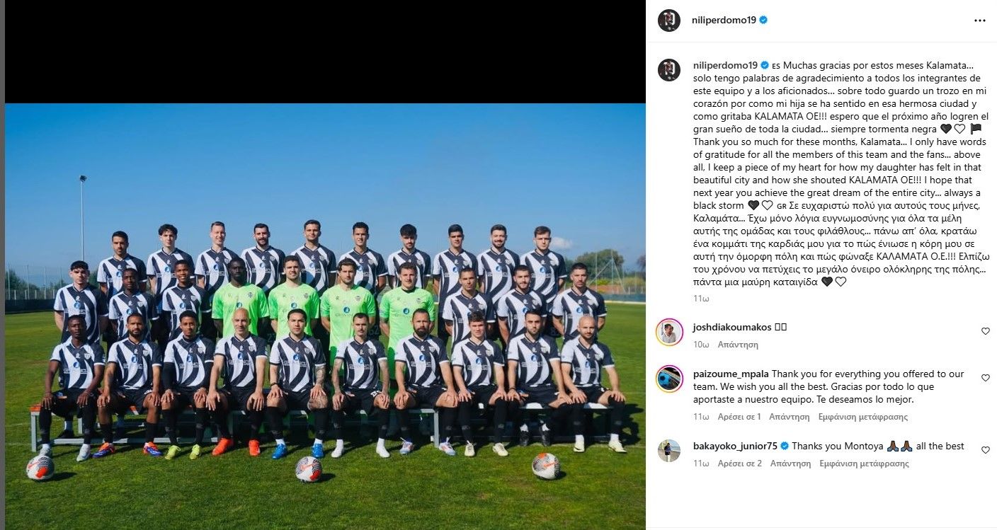 Νέο σταθμό στη πλούσια καριέρα του αναζητά ο Νίλι Περντόμο. Ο 31χρονος Ισπανός μέσος με ανάρτησή του στο instagram αποχαιρέτησε την Καλαμάτα τη φανέλα της οποίας φόρεσε το τελευταίο εξάμηνο. Ο Νίλι αναφέρθηκε με λόγια ευγνωμοσύνης και ευχήθηκε στη “Μαύρη Θύελλα” να πετύχει το όνειρο της ανόδου.