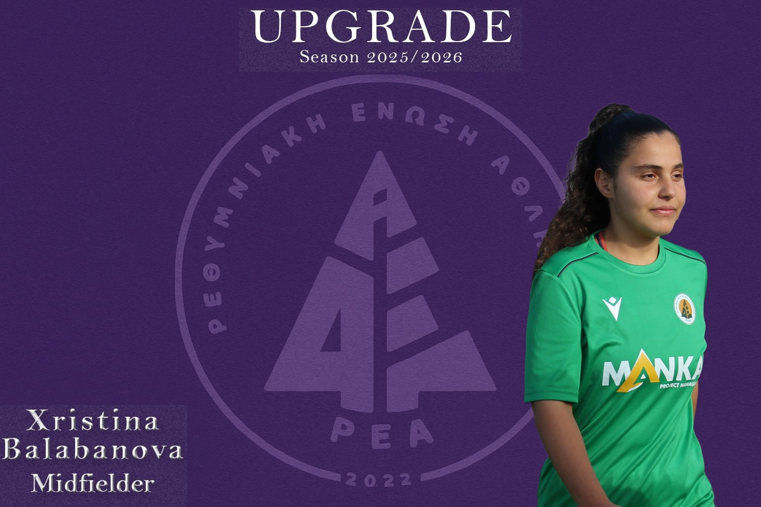 Η Ρ.Ε.Α. βρίσκεται στην ευχάριστη θέση να ανακοινώσει την ένταξη της Χριστίνας Μπαλαμπάνοβα στο ρόστερ της ομάδας Γυναικών που αγωνίζεται στην Α’ Εθνική Κατηγορία Ποδοσφαίρου Γυναικών.