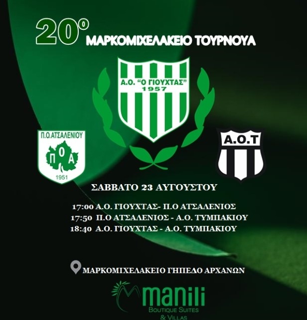 Ο οικοδεσπότης Α.Ο. Γιούχτας θα φιλοξενήσει στις Αρχάνες το Σάββατο στις 23 Αυγούστου τον Π.Ο.Ατσαλένιου και τον Α.Ο. Τυμπακίου στο πλαιίσιο του 20ου Μαρκομιχελάκειου Τουρνουά που διεξάγεται κάθε χρόνο και αποτελεί και ένα καλό τεστ για τις ομάδες.