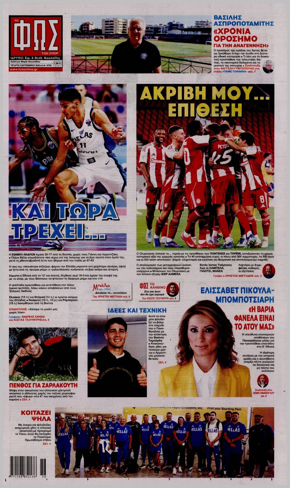 Τα αθλητικά πρωτοσέλιδα της Τετάρτης (3/9)