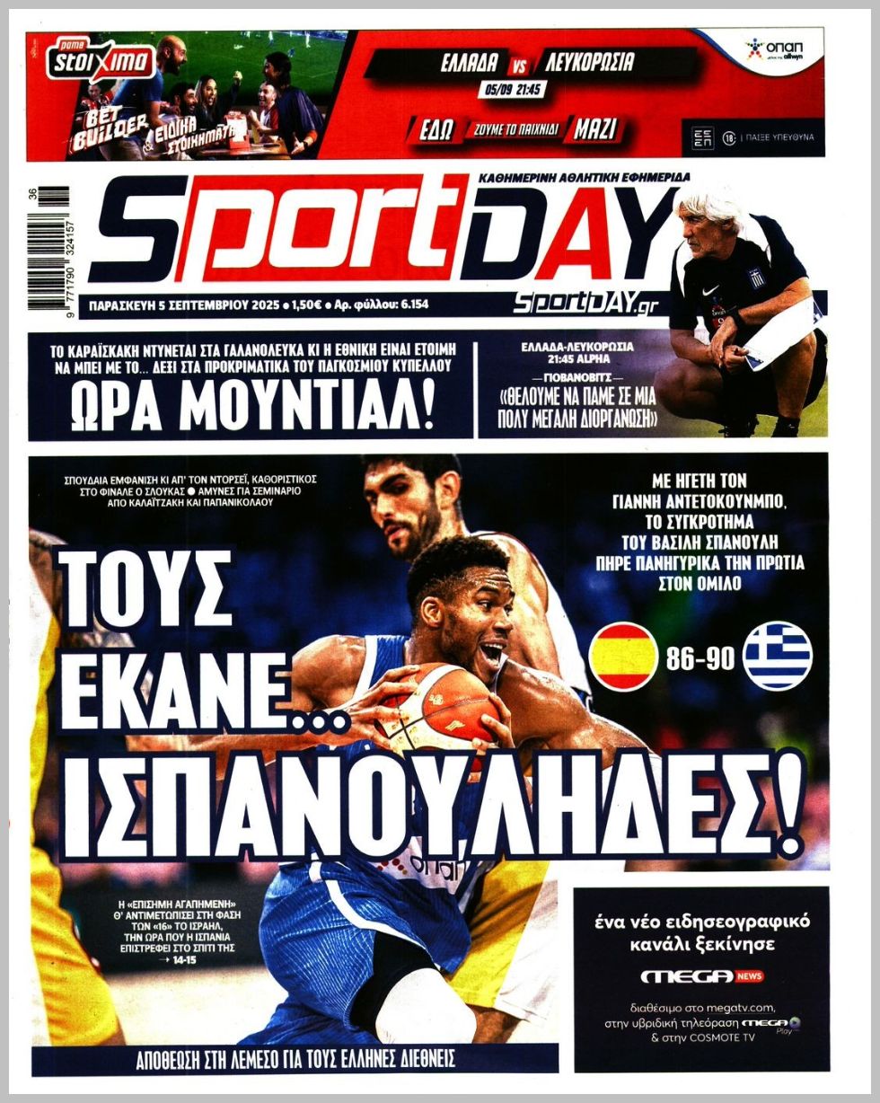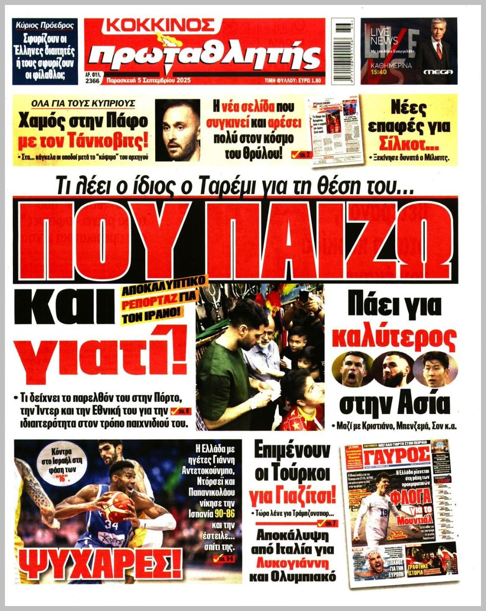 Τα αθλητικά πρωτοσέλιδα της Παρασκευής (5/9)