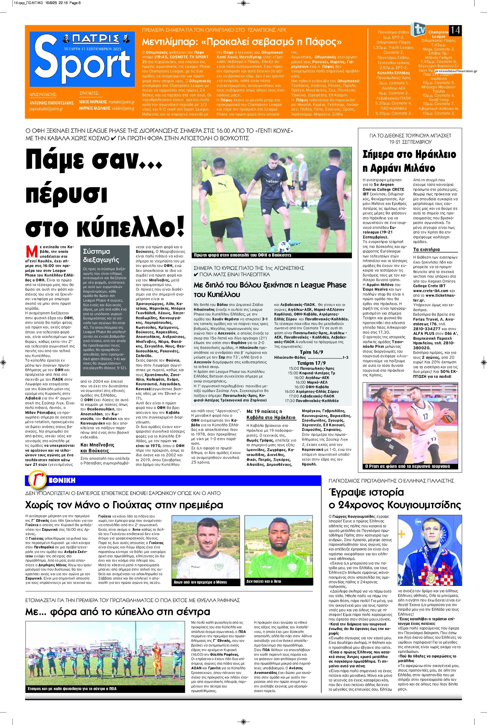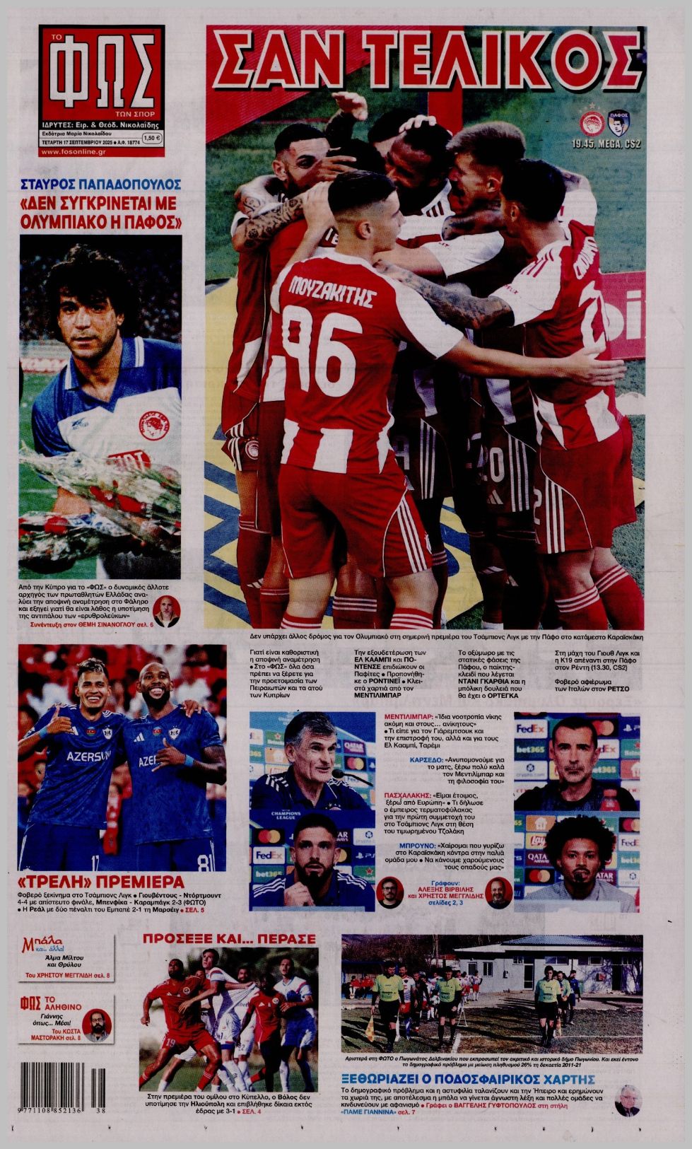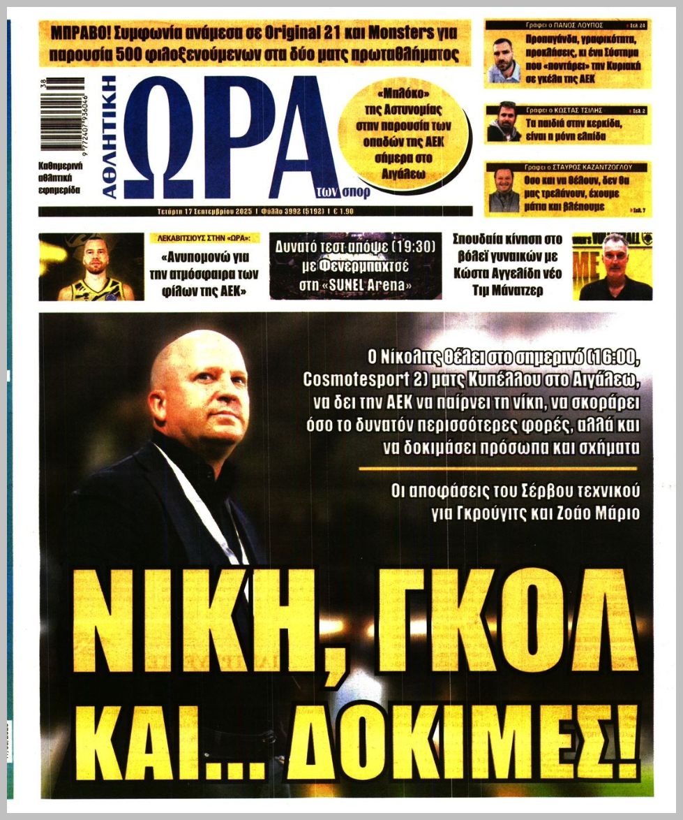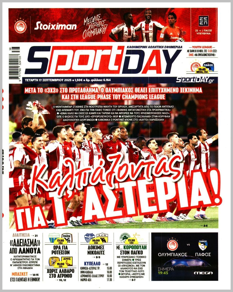 Τα αθλητικά πρωτοσέλιδα της Τετάρτης (17/09)