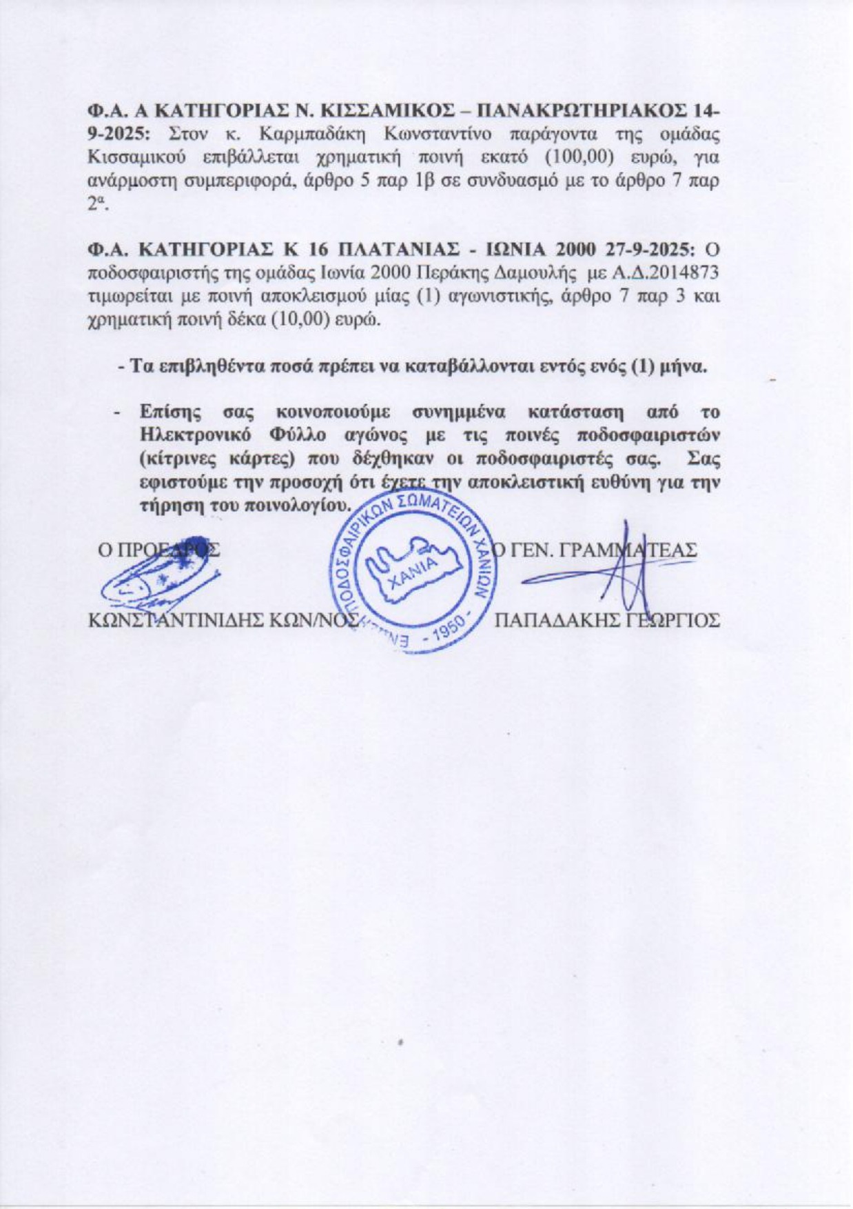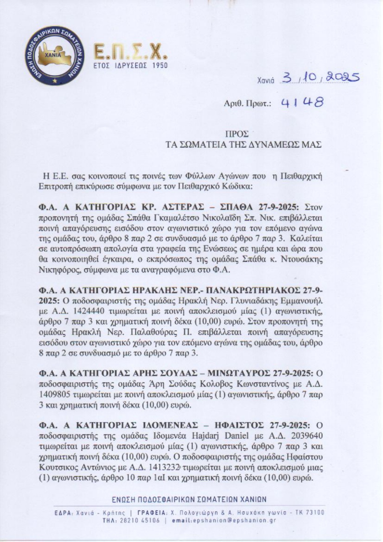 Γνωστές έγιναν οι ποινές της Πειθαρχικής Επιτροπής της Ένωσης από την ΕΠΣ Χανίων όπου μεταξύ αυτών που ανακοινώθηκαν, ξεχωρίζουν η ποινή μιας αγωνιστκής εκτός πάγκων στους Σπύρο Νικολαΐδη και Παναγιώτη Παλαθούρα που δεν έχουν δικαίωμα να καθίσουν στους πάγκους των ομάδων τους.