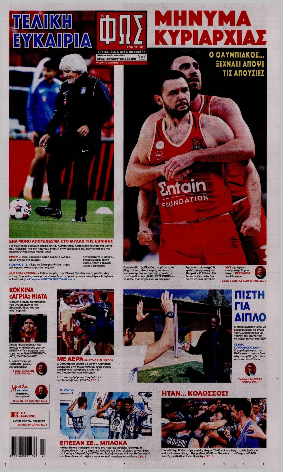 Τα αθλητικά πρωτοσέλιδα της Τετάρτης (22/10)