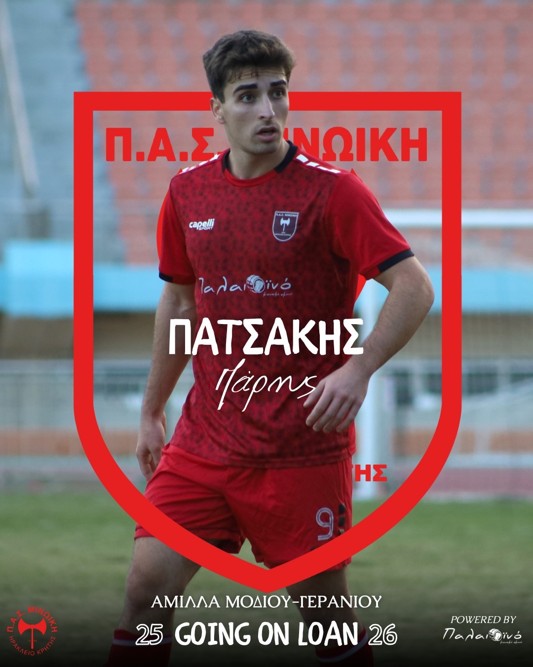 Η Μινωική ανακοίνωσε και επίσημα τη μετακίνηση του 25χρονου επιθετικού Πάρη Πατσάκη στην Άμιλλα Μοδίου, όπου θα συνεχίσει να αγωνίζεται τη φετινή σεζόν, εξαιτίας των στρατιωτικών του υποχρεώσεων που θα διαρκέσουν έως τον Γενάρη.