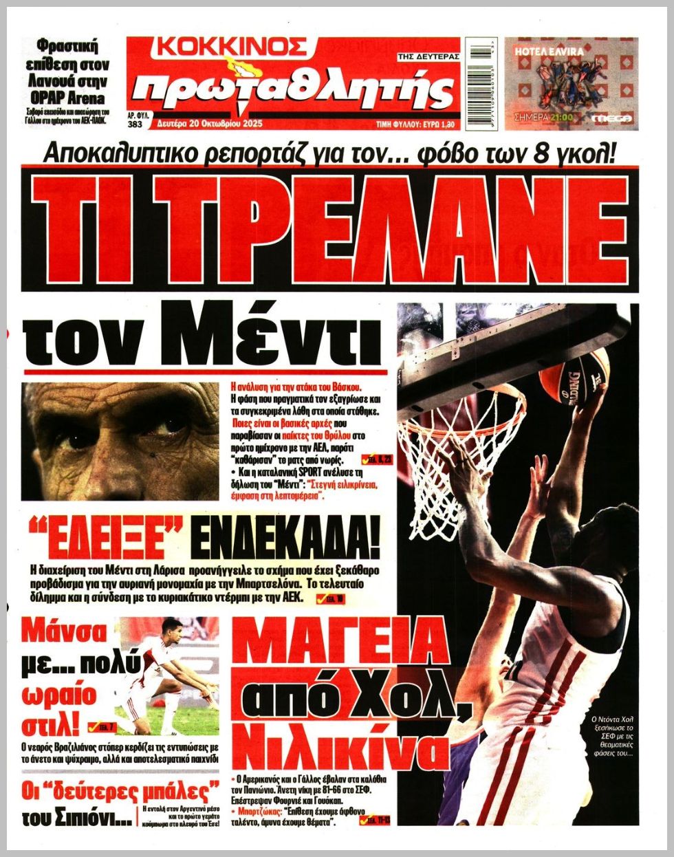 Τα αθλητικά πρωτοσέλιδα της Δευτέρας (20/10)