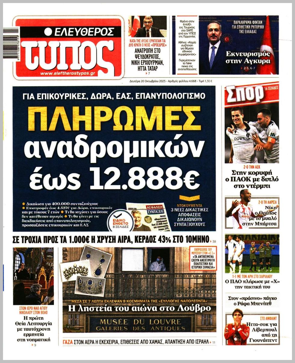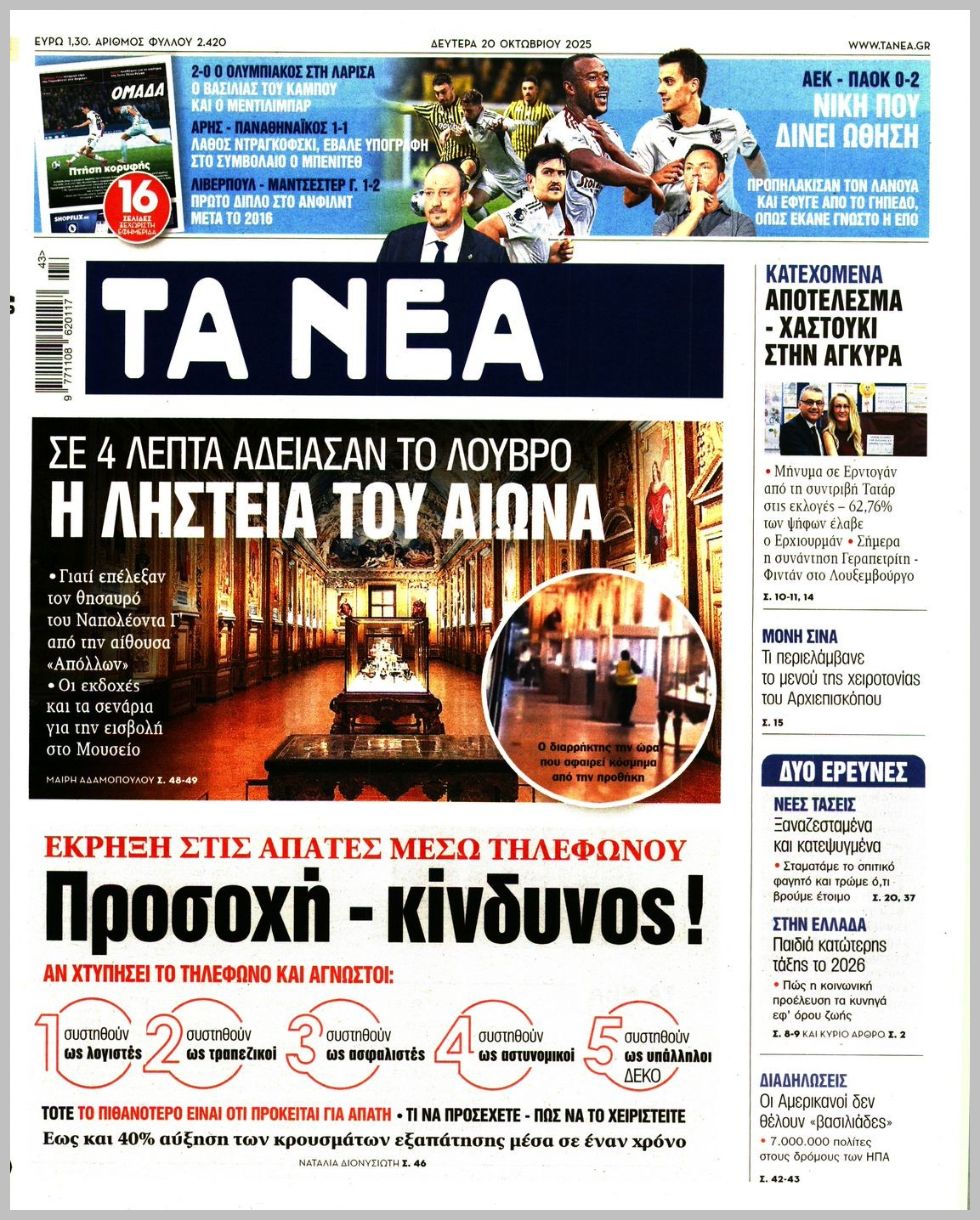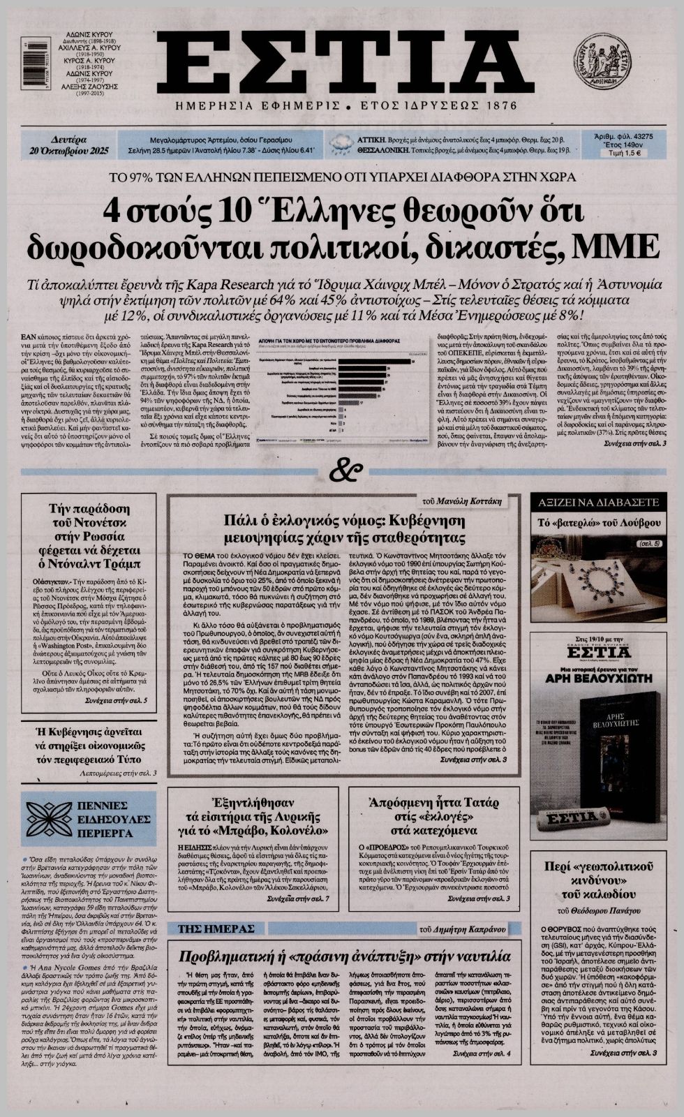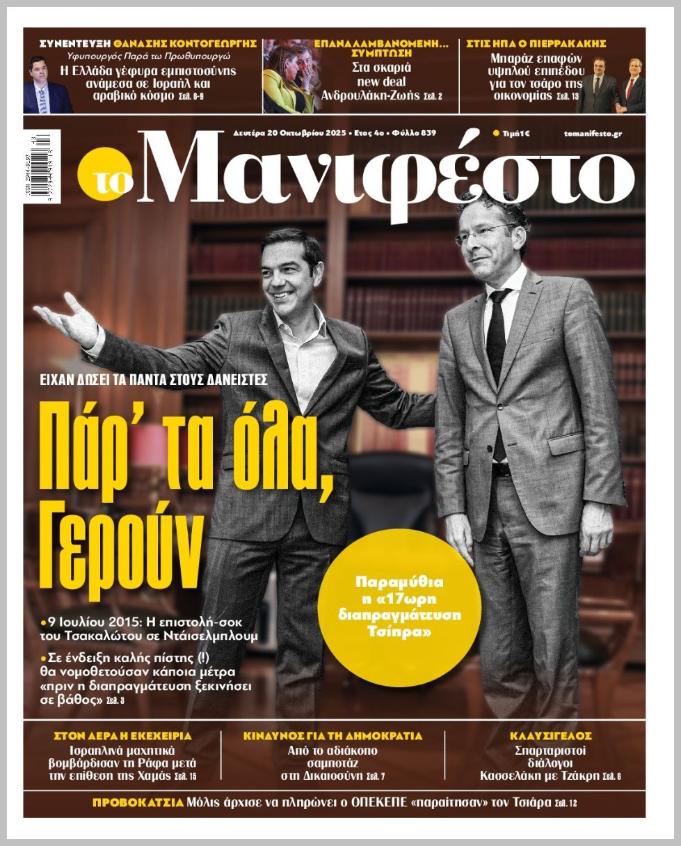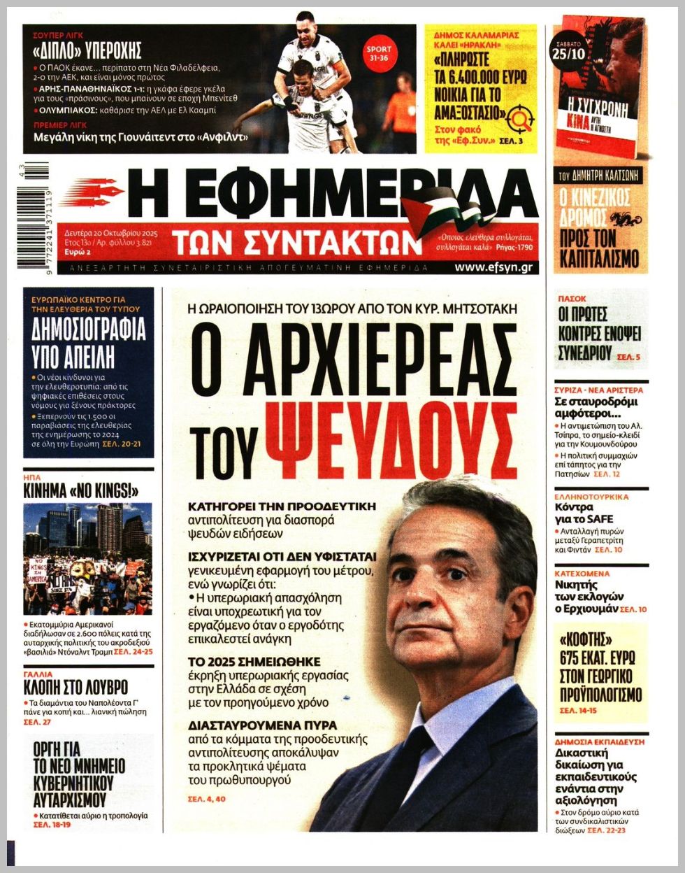 Τα πρωτοσέλιδα της Δευτέρας (20/10) σε Κρήτη και Αθήνα