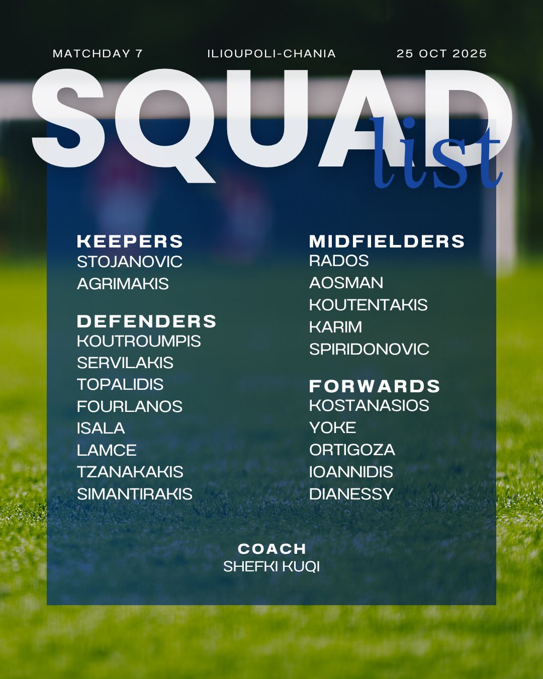 Η αποστολή της ομάδας που ταξίδεψε στην Αθήνα αποτελείται από τους εξής ποδοσφαιριστές: Στογιάνοβιτς, Αγριμάκης, Κουτρουμπής, Λάμτσε, Φουρλάνος, Ισάλα, Σερβιλάκης, Τοπαλίδης, Τζανακάκης, Σημαντηράκης, Ράδος, Κουτεντάκης, Καρίμ, Σπιριντόνοβιτς, Αοσμαν, Κωστανάσιος, Ορτιγκόθα, Γιοκέ, Ντιανεσί, Ιωαννίδης.