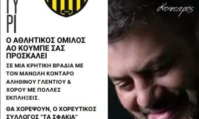 Στις 22/08 θα σμίξουν ΑΟ Κουμπές και Μανώλης Κονταρός, ώστε να πραγματοποιηθεί η ετήσια χοροεσπερίδα της ομάδας. Στον προαύλιο χώρο του Γενικού Λυκείου Ελευθερίου Βενιζέλου...